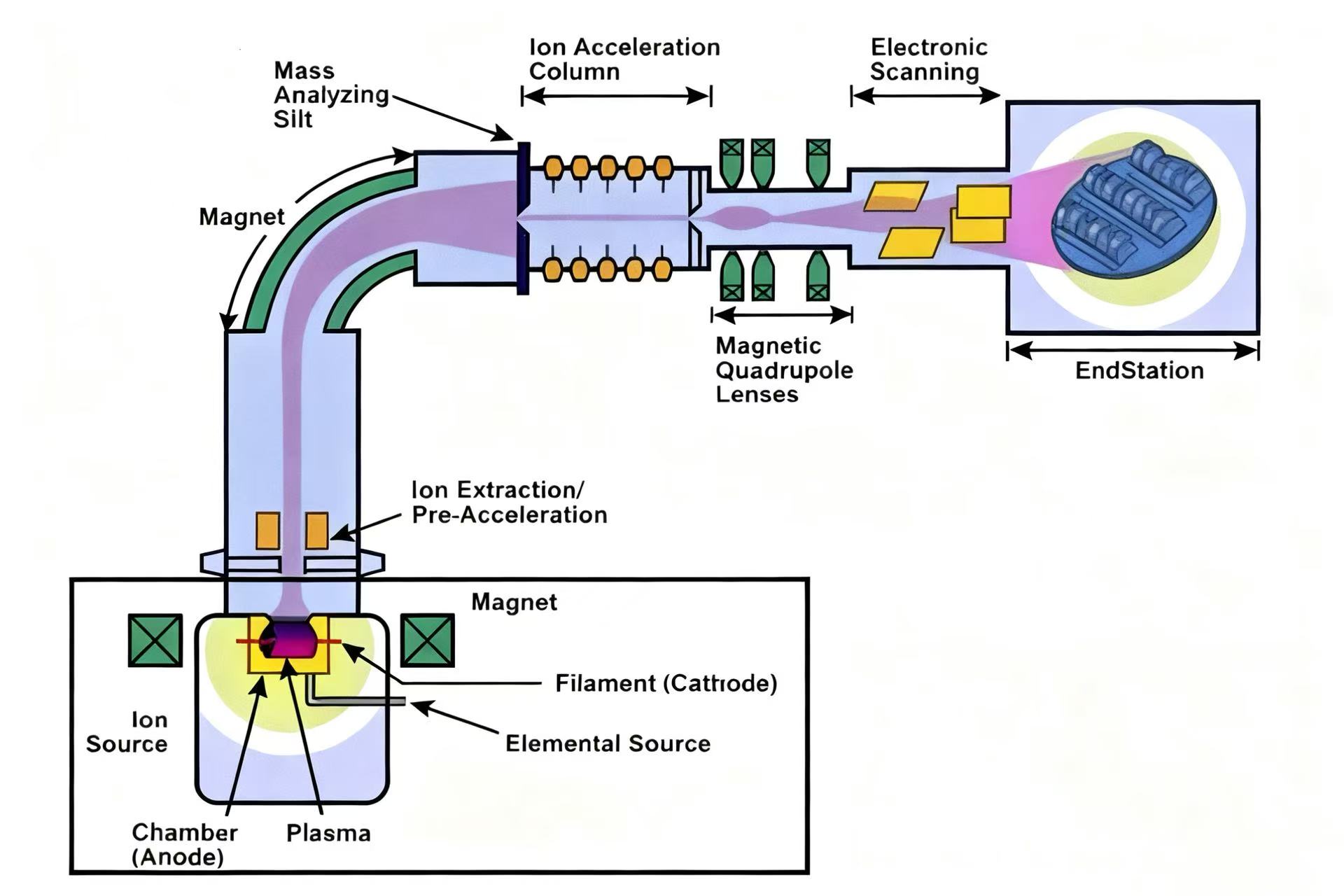 2.আয়ন ইমপ্লান্টেশন হল সেমিকন্ডাক্টর উৎপাদনের প্রাথমিক ডোপিং কৌশল, যার বেশ কিছু সুবিধা রয়েছে, যেমন উচ্চ ডোপিং নির্ভুলতা, নিম্ন প্রক্রিয়া তাপমাত্রা এবং সাবস্ট্রেট উপাদানের সামান্য ক্ষতি। বিশেষত, আয়ন ইমপ্লান্টেশন প্রক্রিয়া চার্জযুক্ত আয়ন তৈরি করতে অপরিচ্ছন্নতা পরমাণুগুলিকে আয়নাইজ করে, তারপর একটি উচ্চ-শক্তি আয়ন রশ্মি তৈরি করতে একটি উচ্চ-তীব্রতা বৈদ্যুতিক ক্ষেত্রের মাধ্যমে এই আয়নগুলিকে ত্বরান্বিত করে। অর্ধপরিবাহী পৃষ্ঠ তারপরে এই দ্রুত-চলমান আয়ন দ্বারা আঘাত করা হয়, যা সামঞ্জস্যযোগ্য ডোপিং গভীরতার সাথে সুনির্দিষ্ট ইমপ্লান্টেশনের অনুমতি দেয়। এই কৌশলটি বিশেষভাবে অগভীর জংশন স্ট্রাকচার তৈরি করার জন্য উপযোগী, যেমন MOSFET-এর উৎস এবং ড্রেন অঞ্চল, এবং অমেধ্য বিতরণ এবং ঘনত্বের উপর উচ্চ-নির্ভুলতা নিয়ন্ত্রণের অনুমতি দেয়।