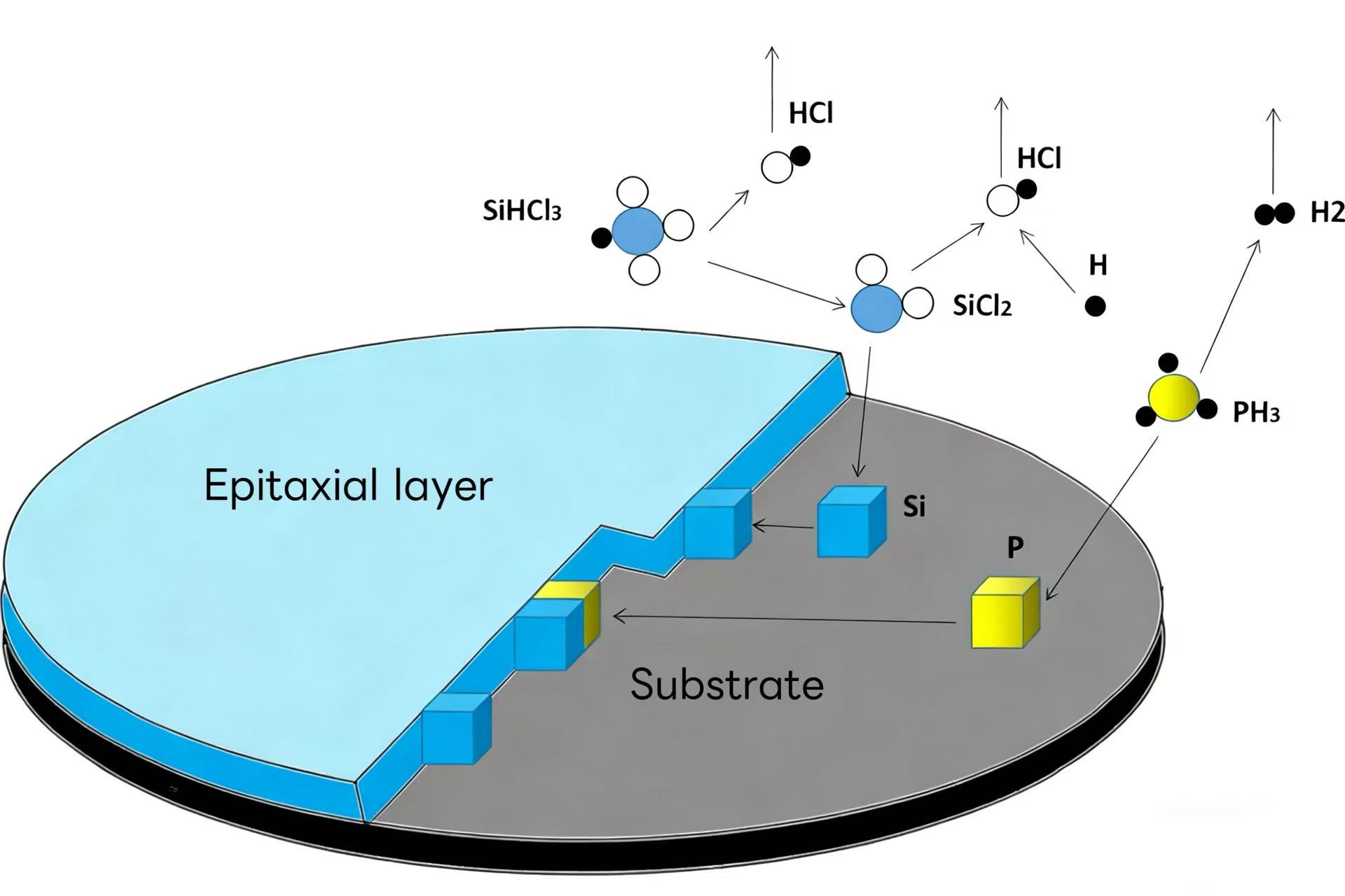 সিলিকন এপিটাক্সি সাধারণত একটি বাষ্প ফেজ এপিটাক্সি ফার্নেস ব্যবহার করে। এর নীতি হল যে সিলিকন উৎসের পচন (যেমন সিলেন, ডাইক্লোরোসিলেন, ট্রাইক্লোরোসিলেন এবং সিলিকন টেট্রাক্লোরাইড হাইড্রোজেনের সাথে বিক্রিয়া করে সিলিকন তৈরি করে। বৃদ্ধির সময়, PH₃ এবং B₂H₆ এর মতো ডোপিং গ্যাসগুলি প্রবর্তন করা যেতে পারে একযোগে আংশিক গ্যাসের চাপ নিয়ন্ত্রণ করে। একটি নির্দিষ্ট প্রতিরোধ ক্ষমতা সহ একটি এপিটাক্সিয়াল স্তর গঠন করতে।