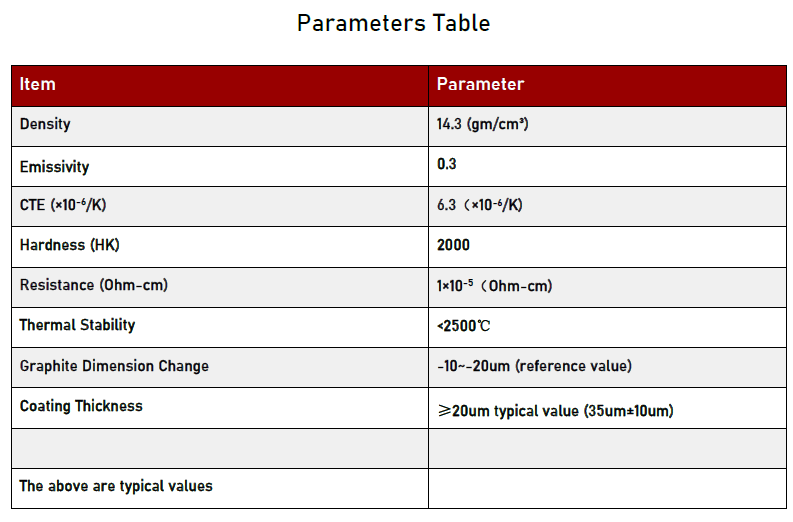 ট্যানটালাম কার্বাইড একটি অত্যন্ত উচ্চ গলনাঙ্ক (প্রায় 3880℃), চমৎকার তাপ পরিবাহিতা, উচ্চতর রাসায়নিক স্থিতিশীলতা, এবং অসামান্য যান্ত্রিক শক্তি সহ উচ্চ-কার্যকারি উপাদান। নির্দিষ্ট কর্মক্ষমতা পরামিতি নিম্নরূপ: